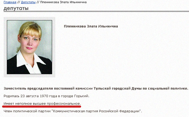 А зачем тратиться зря? Он и с таким незаконченным(муж) выделил ей место в гордуме.Кто из бабушек-дедушек знал,кто такая Злата? Голосовали за коммунистов и Зюганова. А,может,на корочку просто денег партийных не хватило?