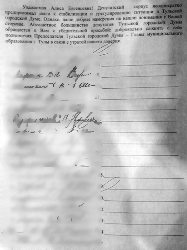 На текущий момент,как сообщили в ТСН,там подписалось аж 29 человек. Почти все её бывшие соратники по всяким партийным и прочим делам.Замы,помы,члены комиссий и пр. лизоблюды. Т.е. её работой они недовольны. А вот своей -так очень довольны. Она им предложила Думу распустить полностью. Но от этого депутаты ПОЧЕМУ-ТО отказались. Всеми силами надо выполнить заказ сверху- убрать Алису. А то уже перед страной неудобно,прославились — 35 мужиков одну "бабу" не могут осилить. Клоуны,да и в облдуме такие же ими управляют. И еще пишут в заявлении,что действуют по поручению избирателей!
