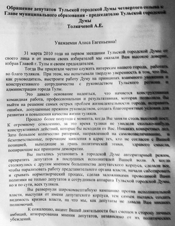 Г-да депутаты! Вы о чем пишете в обращении? …от имени своих избирателей мы оказали Вам высокое доверие,избрав Главой г.Тулы и своим председателем…." А какие избиратели с вашим выбором соглашались? Вы у нас,избирателей,разве спрашивали? А теперь на избирателей ссылаетесь. Как без избирателей по указке сверху она вам всем(Яблоку — респект!-почти всем) понравилась,так сейчас опять же почти всем(Яблоку -двойной респект!) сразу по той же указке разонравилась. Вы ж тогда аж подвизгивали от восторга.Можно поднять архивы и вспомнить.Куприянов,Зотов,Лебедев,Атанов,Могильников -такой хор гремел! Хвалили,не уставая. И деловая и умная,разбирается в коммунальном хозяйстве,женщина,наконец! Единственный мэр -женщина! Восторг! Что изменилось-то? С 7-го этажа указание другое прищло? Или любимое детище затронула- УК г.Тулы? Посягнула на святое? На супердоходы от грабежа населения? Захотела создать конкуренцию и кусочек взять в управление? Или не пошла на какую-то нечестную сделку,не отдала имущество города в чьи-то ручки шаловливые? ВЫ ж не куклы-марионетки,которых дергают за веревочки! Вернее,вы — эти куклы и есть.Только избирателям такие куклы не нужны,не надо нашим мнением прикрываться. Вы его не спрашивали. К тому же вашей работы за 8 месяцев никто в округах так и не увидел!