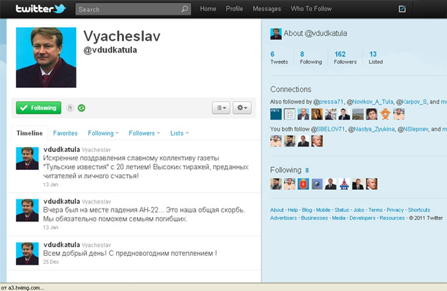 Он зарегистрировал аккаунт в «Твиттере» . Правда, на официальном сайте администрации ссылки на этот ресурс не найти. На его страничке всего три записи — первая от 25 декабря, последняя от 13 января. К себе в друзья Вячеслав Дудка записал восьмерых, его пытались «зафолловить» 156 человек. Но попытки общения, похоже, ограничиваются просмотром страницы — «не появилось ли чего-то».