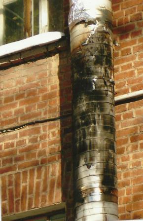 Эта труба крепится на стене нашего дома в непосредственной близости от окон квартир и пересекает газовую трубу и электрокабели.
