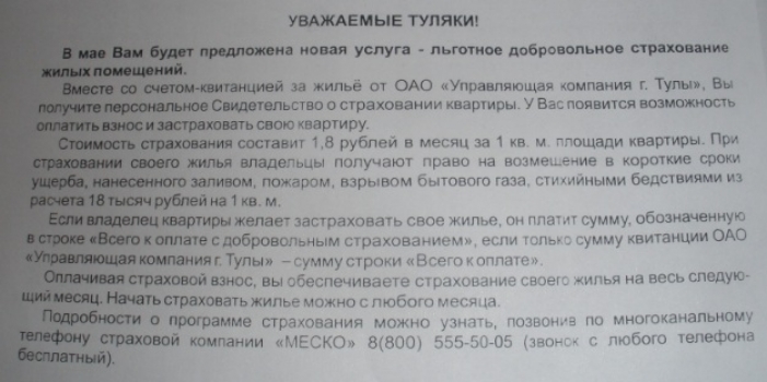 На днях жильцы домов обслуживаемых ОАО »УК г. Тулы» получили квитки на оплату квартиры со следующей надписью на обороте: