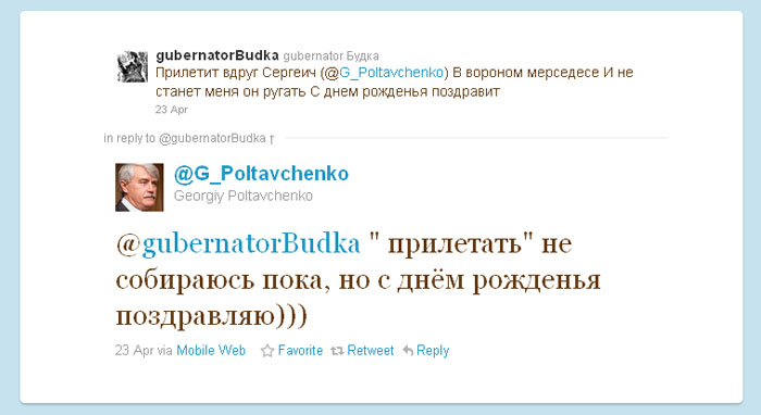 На него с юмором (никакой иронии, почитайте твиттер @G_Poltavchenko и убедитесь сами) откликнулся полномочный представитель президента в Центральном федеральном округе Георгий Полтавченко (фото слева вверху).