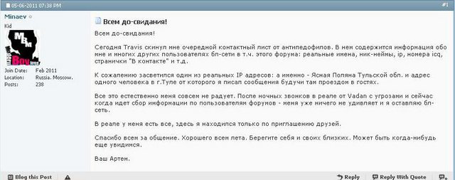 … на одном из педофильских форумов появилось вот такое сообщение от Минаева: