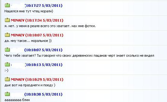 Круто, да? Я сразу же позвонила в Тулу в ГУВД и сказала, что Минаева можно будет взять с поличным в деревне. Попросила связаться с ГУВД Белгородской Области. Но этого не произошло. Видимо, празднование восьмого марта оказалось дороже жизней и здоровья малолетних детей и значительнее, чем поимка преступника. Соответственно, мне пришлось отказаться от приглашения. Хотя честно говоря, хотелось уже самой туда поехать, лично скрутить этого гада и привести в ближайшее ОВД. Видимо, этого хотели сотрудники полиции. В итоге один ехать в деревню он не захотел, но произошло следующее: