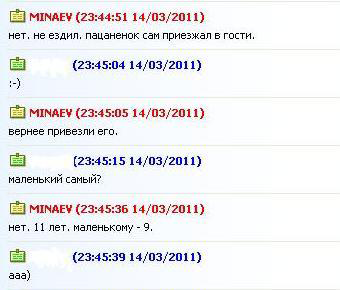 Сегодня я вам расскажу одну любопытнейшую историю про педофила, представляющегося в Сети Артемом Минаевым, еще известного в среде педофилов как Taller. Долго не хотела публиковать информацию о нем, так как надеялась на возбуждение уголовного дела, но в свете последних событий у меня уже нет выбора. Но обо всем по порядку. Познакомилась я с Минаевым 24 января 2011 года. Я нашла его контакты на педофильском форуме «Звездный принц». Общение у нас завязалось сразу, он мне поверил и с первых же часов общения стал сливать мне инфу о себе. В тот же день признался в сексуальных контактах с восемью маленькими мальчиками.