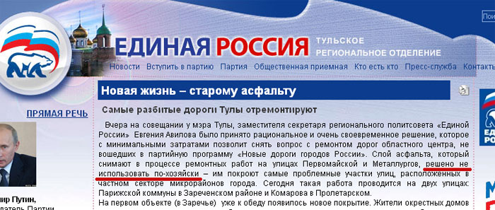 дожили — партия власти похваляется тем, что ремонтирует дороги БУшным асфальтом.