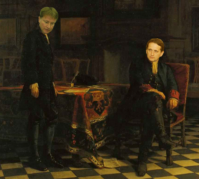 Поводом для фотожабы этой пятницы послужил недавний юбилей Администрации Президента РФ, вместо приглашения на который тульский губернатор получил дипломатичный нагоняй за отсутствие отопления в узловской музыкальной школе. Основой изображения стала картина Николая Ге (его портрет слева), написавшего, кстати, ещё и знаменитого Льва Толстого за работой, «Петр I допрашивает царевича Алексея в Петергофе».