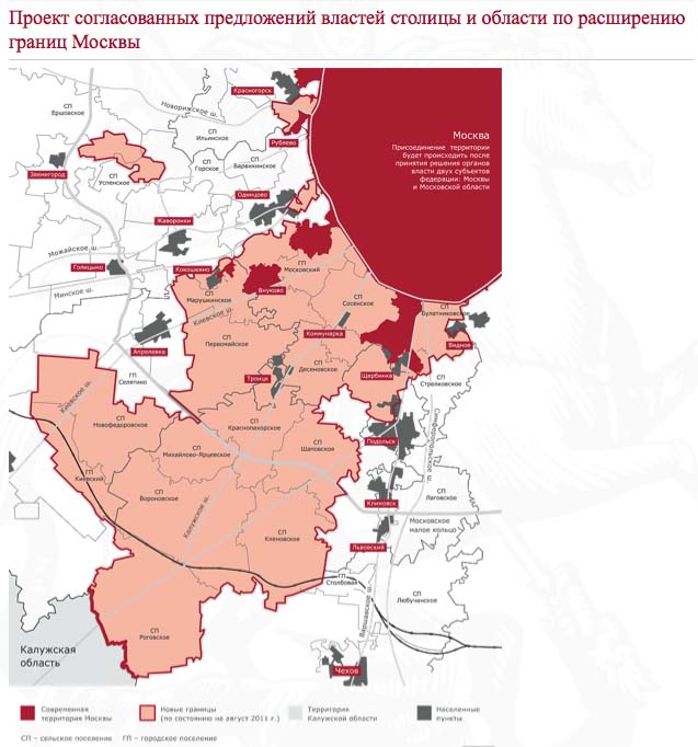 В газете “Ведомости” опубликован проект согласованных предложений властей столицы и области по расширению границ Москвы.